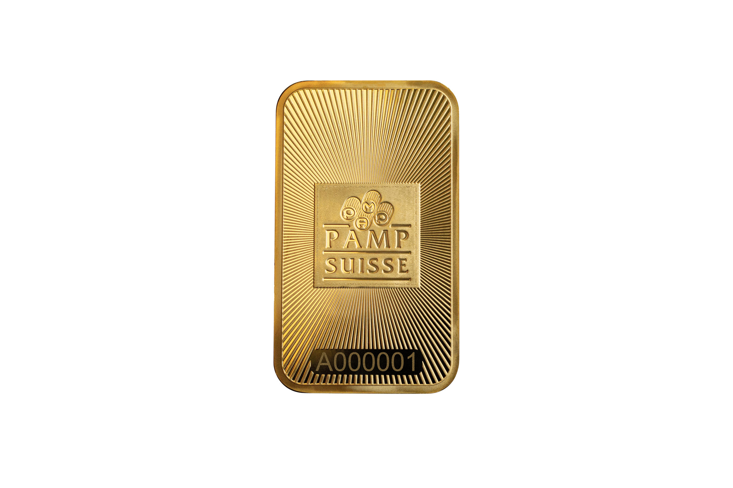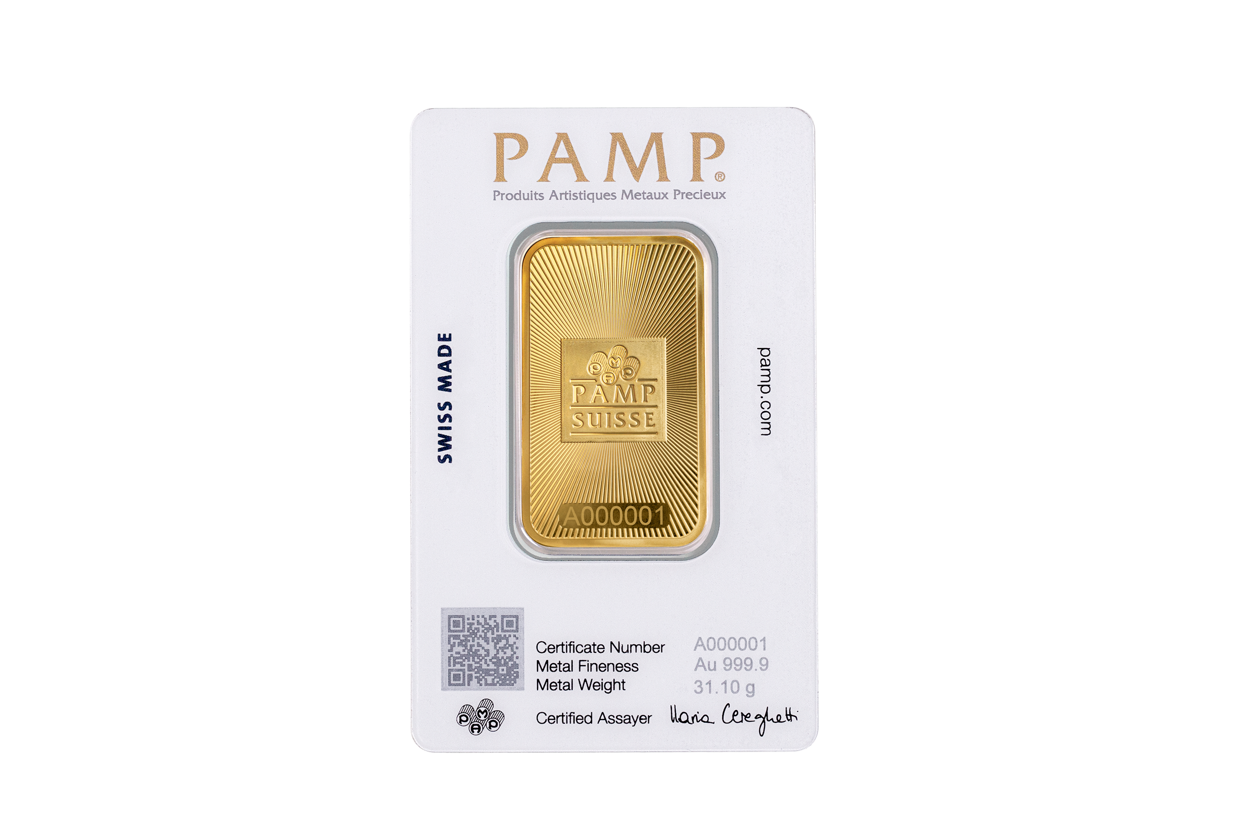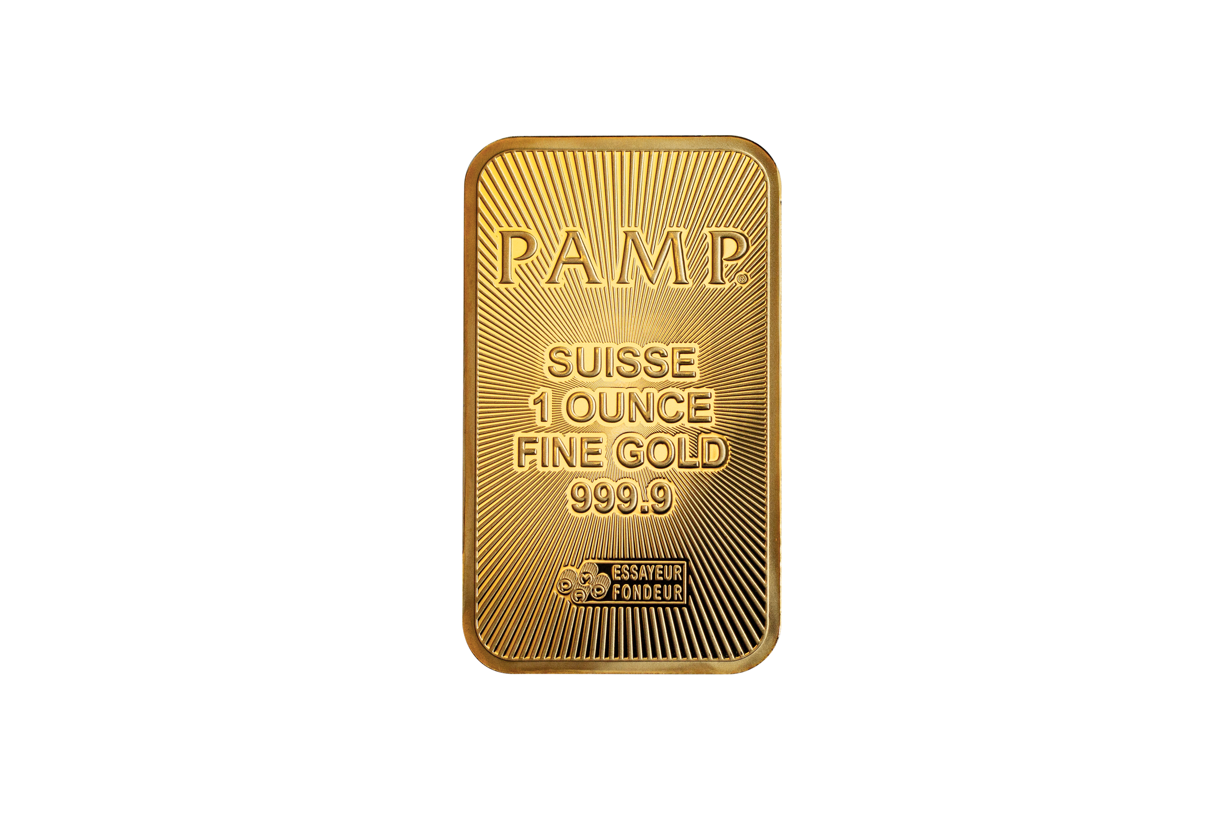 The newly redesigned PAMP Suisse 999.9 1oz fine gold ingot is produced to the highest quality standards and artistry for which the PAMP bullion brand is trusted worldwide. Accredited by the Swiss Federal Bureau, each bar is individually registered and sealed within protective CertiPAMP™ packaging with an integrated and official Assay Certificate that guarantees the fine precious metal content and weight, protected with a removable film. The reverse side design is adapted from PAMP’s original founding logo recorded within its archives, distinguished by a central square framing the world-famous hallmark of four initialized dies that together form the PAMP name. Minted with a Brilliant Uncirculated bullion finish, the PAMP Suisse 1oz gold ingot shimmers with light-refracting micro-ridges emanating from the center. As a security feature, advanced laser technology is used to micro-engrave ‘PAMP Suisse’ continuously along the centered, square border, visible only when viewed through a magnifying glass or jeweler’s loupe.
