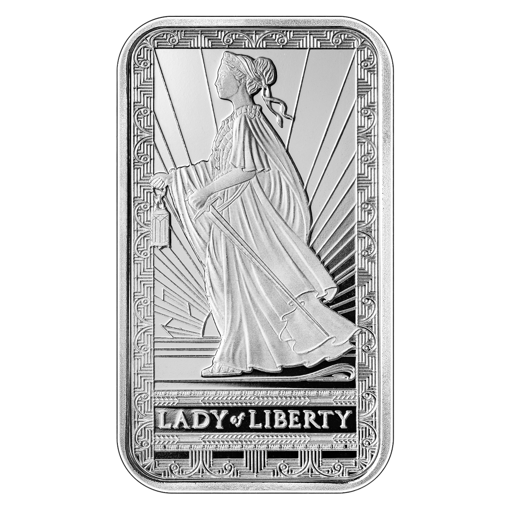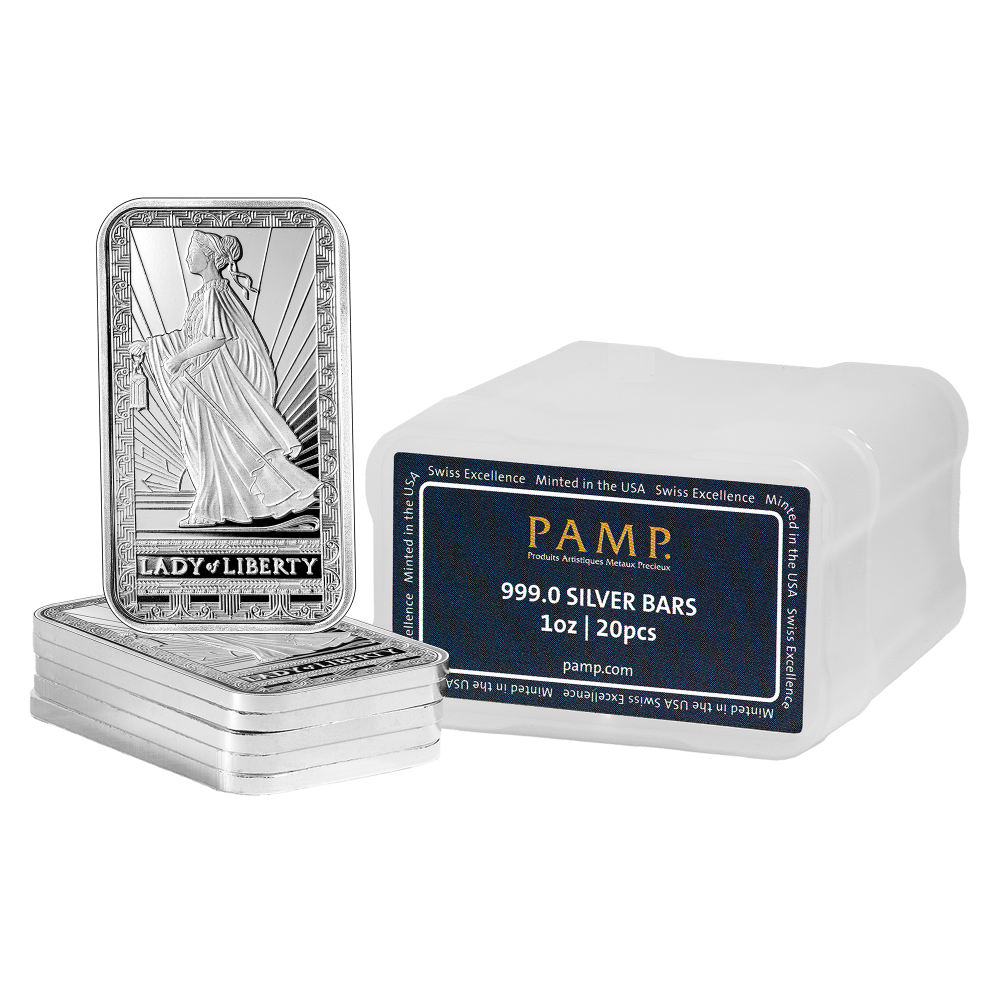 Swiss excellence. Minted in the USA. MKS PAMP GROUP, the producers of PAMP-branded precious metal products, is proud to announce the release of this 999.0 pure silver bar. Produced in state-of-the-art USA minting facilities to exacting Swiss standards, this bar showcases a modernized allegory of the Lady of Liberty with an Art Deco style background. This interpretation of the Lady of Liberty is that of freedom, democracy and enlightenment. These sentiments are symbolized by the Lady of Liberty’s sword defending the freedom of the American people and a fowing Greco-Roman styled toga representing democratic ideals as she carries a lantern lighting the way to a bright future. The obverse of this bar features anti-counterfeit micro-engraving and a special USA mint mark. Packaged in 20-count PAMP-branded tubes.